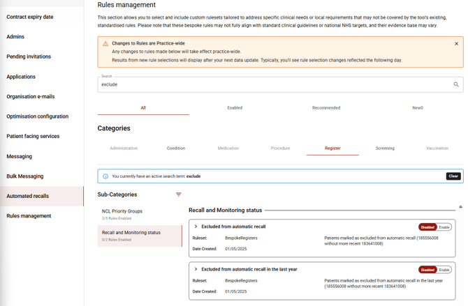 NB: Just adding the code to the notes will not automatically exclude these patients, you also need to turn the rule on for your practice in the User Management Portal.