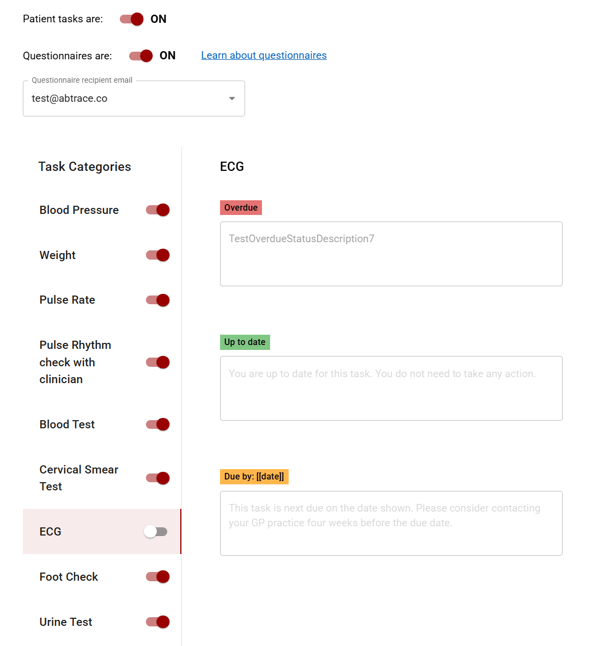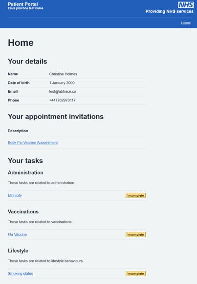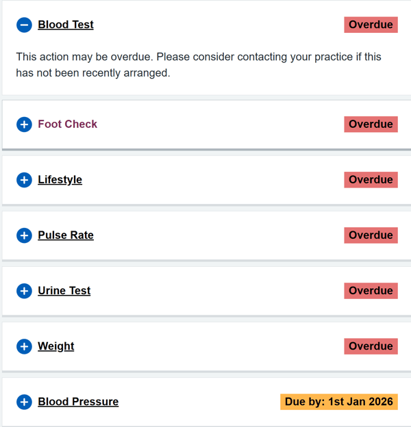 Patients are shown only the tasks that apply to the individual, the relevant status, and are given either default, or customised instructions. These instructions can be set by the practice.